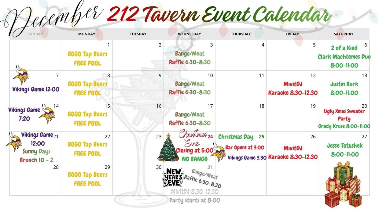 Check out our calendar or on facebook to see what's happening at 212 Tavern.